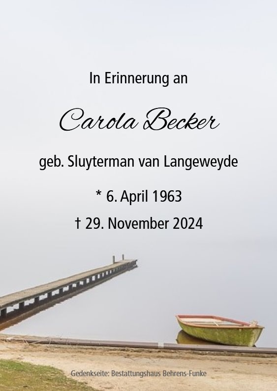 Liebe Carola, es gibt den Spruch " Nimm dir Zeit für deine Freunde, bevor die Zeit dir deine Freunde nimmt" ich weiß nicht von wem der stammt. Daran denke ich jetzt oft. Wir wollten uns immer mal wieder treffen, aber es hat nicht geklappt. Für mich bleibt unvergessen die Zeit, die wir zusammen hatten. Zum Beispiel Schule schwänzend auf einem Fahrrad unterwegs zum Flugplatzgelände in Rostrup, fröhlich und laut singend "99 Luftballons" und andere auch spontan selbgedichtete Lieder. Hauptsache laut singen. Tee trinken im alten Bunker statt Mathe... Lange ist es her.