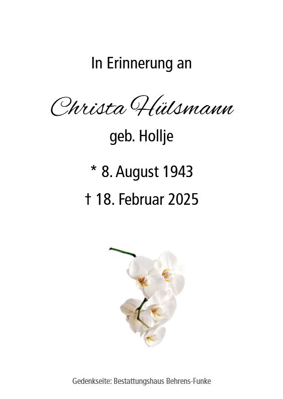 in dieser Zeit des Schmerzes wünschen wir Ihnen Kraft, den Verlust im Kreise Ihrer Liebsten zu verarbeiten. Als Zeichen unserer Anteilnahme und des Gedenkens entzünden wir dieses erste Licht. Möge diese Gedenkseite Ihnen helfen, Erinnerungen zu teilen und so das Andenken gemeinsam wachzuhalten.