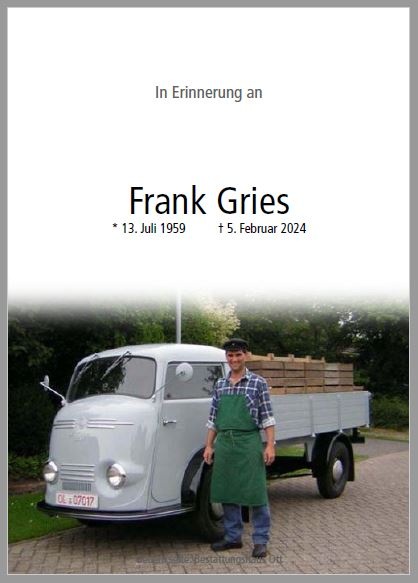 Liebe Familie, für uns ist es immer noch unfassbar, dass Frank nicht mehr unter uns ist. Wir trauern mit euch und wünschen euch für die kommende Zeit viel Kraft. Fühlt euch gedrückt. In stiller Mittrauer Hansjörg und Gabi