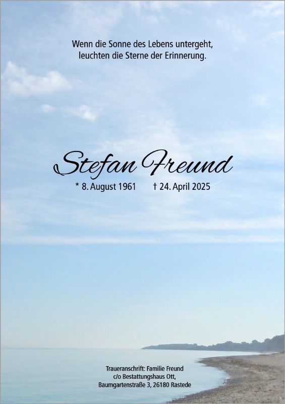in dieser Zeit des Schmerzes wünschen wir Ihnen Kraft, den Verlust im Kreise Ihrer Liebsten zu verarbeiten. Als Zeichen unserer Anteilnahme und des Gedenkens entzünden wir dieses erste Licht. Möge diese Gedenkseite Ihnen helfen, Erinnerungen zu teilen und so das Andenken gemeinsam wachzuhalten.